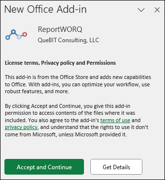 - If the add-in is not installed, you are prompted to Accept and Continue, and then you are prompted to log in to ReportWORQ.