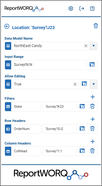 To define a filter, specify a field name to be used in the data model and select a single cell to contain the filter. There can be zero or more filters. - Row Headers — Defines rows in the data model. Specify a field name and select a single column that contains the row headers. You can type a cell reference or select the