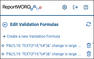 When you select Manage Validation Formulas, the Edit Validation Formulas area appears. You can create new validations or review and modify existing ones. As you hover over each validation in the list, the cell that is informed by the validation is highlighted in the spreadsheet.