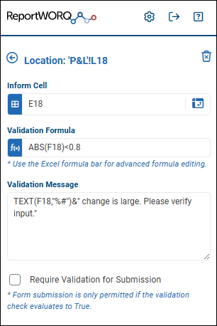 icon and then select the cell. - Validation Formula — The formula that tests the cell value. You can use cell references and Excel functions in the formula.