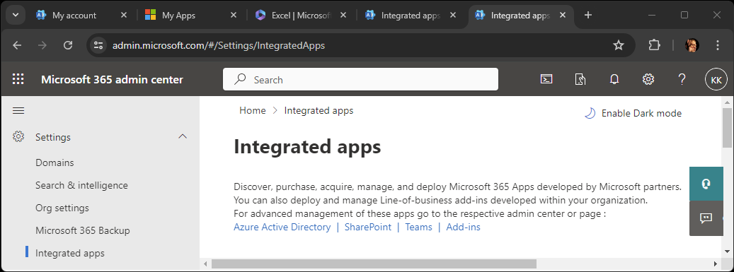- Navigate to Settings > Integrated apps, and then select Add-ins.