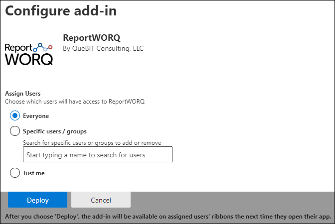 - Use the Search box to find the ReportWORQ add-in, and then select Add.