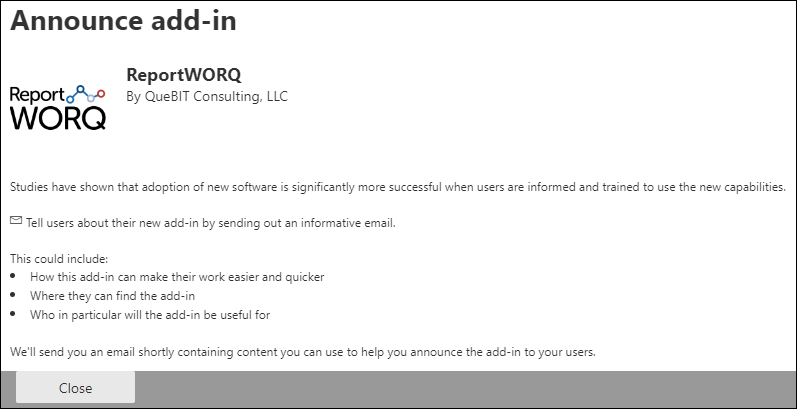 - Review Microsoft’s suggestions about announcing the add-in, and then select Close