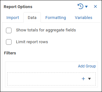 The Report Options area consists of four tabs (Import, Data, Formatting, and Variables).