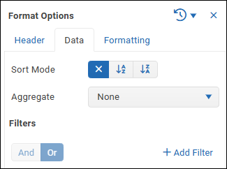- Or — Data must satisfy one or more filter expressions in the group.
