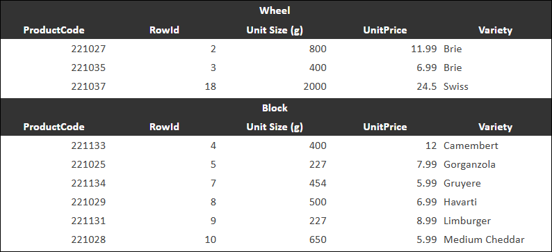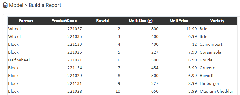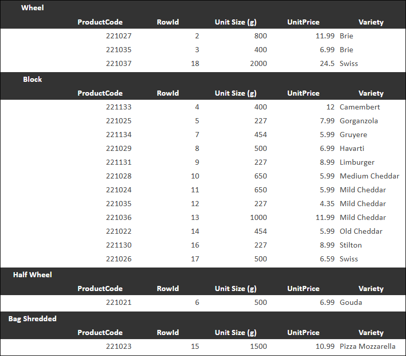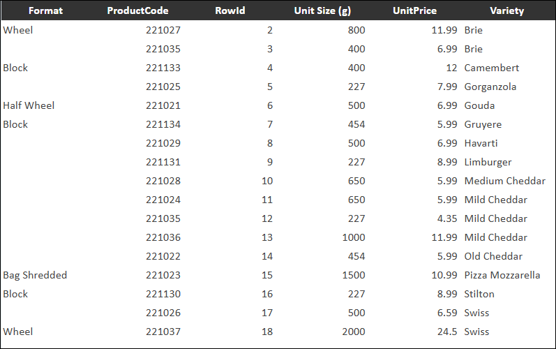 - Merge cells in section row — Displays the values for the sectioned column above their sections. In the following example, the Format column is sectioned, resulting in sections for Wheel and Block.