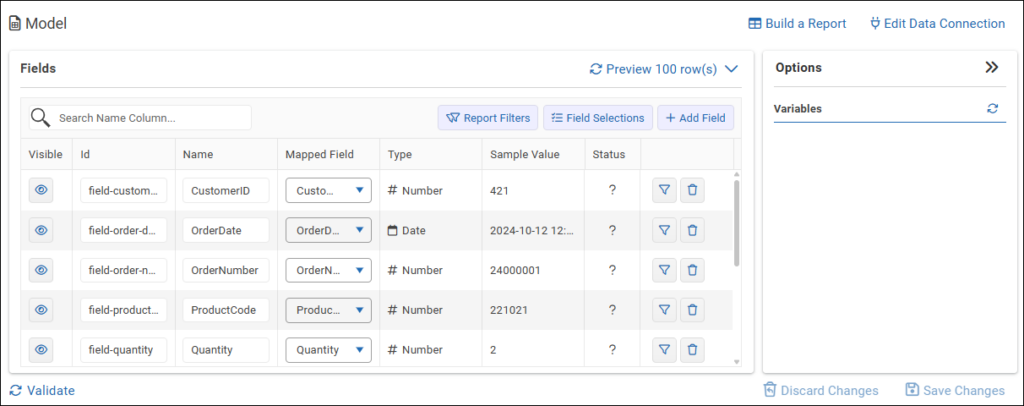 - Visible — Shows or hides the field in the model. Hidden fields can still be referenced in queries.