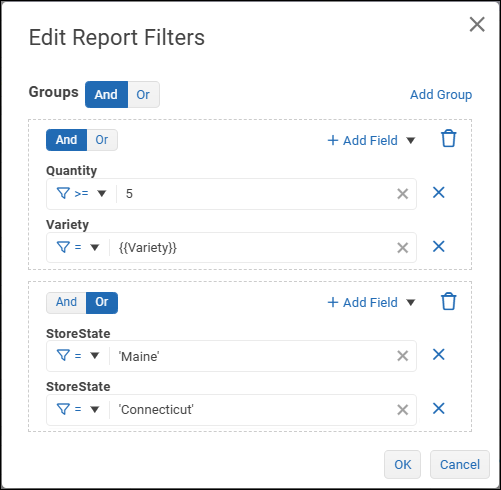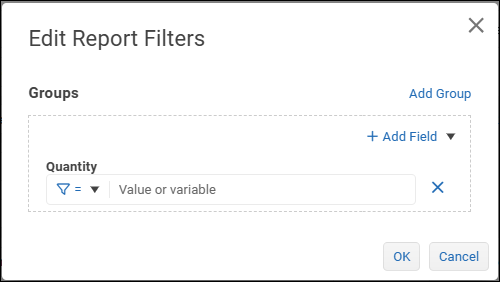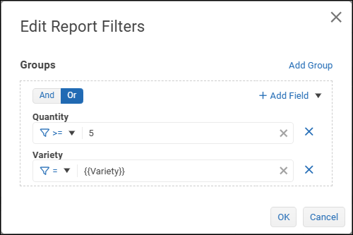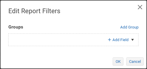 - If the filter group requires additional filter expressions, select Add Field and then select a logical operator at the top of the filter group: