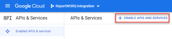 Shows the API & Services page for a sample “ReportWORQ-Integration” Google Project