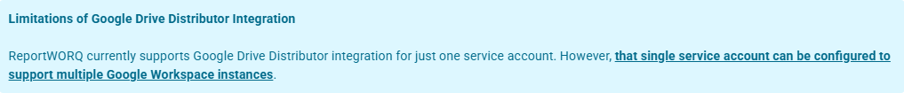 Google Drive Report Providers are used in ReportWORQ to access existing folders and files in Google Drive for developing and executing ReportWORQ report distribution jobs. Each Google Drive Report Provider is linked to a specific Google Drive folder location for a single Google account, which can include Shared Drives visible to the account. ReportWORQ allows developers to only select folders and files that are in the specified location. ReportWORQ Supports Google Drive both as a Report Provider Source and a Distribution Target. ReportWORQ will use a JSON based key from a service account created in Google Workspace. It is expected that this service account will either have read/write access to Shared Drives or with Domain Wide Delegation enabled will have the ability to impersonate users to access their My Drive folders. We recommend the Shared Drives approach as to avoid creating service accounts with Domain Wide Delegation enabled.
