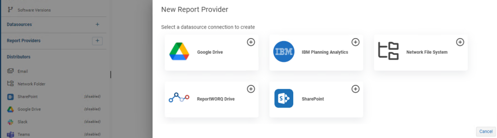 In order to add a Google Drive Report Provider to the list of available providers, ReportWORQ administrators open the Administration screen, then click the ‘+’ button beside Report Providers, and select the Google Drive option. There is no more information to configure, just by adding it to the list of report providers the application folders for each of the enabled IBM Planning Analytics will be available to the user.