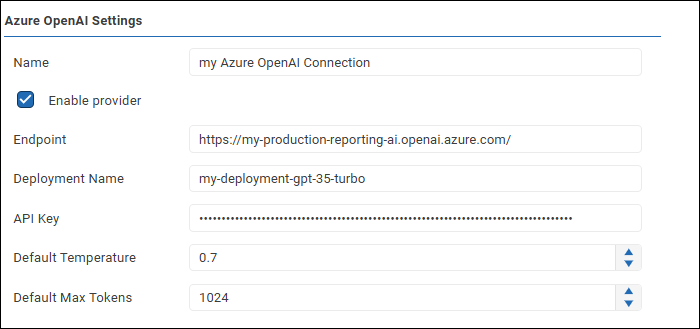 The Azure OpenAI Settings appear. The following example shows configured settings.