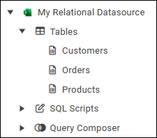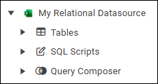 If your datasource’s node in the model tree contains nodes named Tables, SQL Scripts, and Query Composer, as shown in the following figure, it is considered relational for the purposes of report modeling.