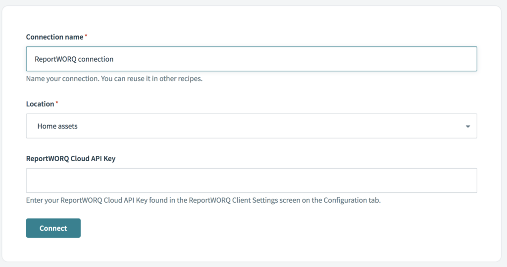 To make use of the app you must set up a connection to ReportWORQ in Workato. This can be done by creating a new connection within a project folder, or a connection can also be configured within a recipe. To set up a connection within a project folder, click on the desired folder and navigate to the drop-down menu next to the “Create Recipe” button. Click on the “Create Connection” option which will direct you to the setup screen. To create the connection you must enter your ReportWORQ Cloud API Token created for the ReportWORQ Rest API cloud connection.