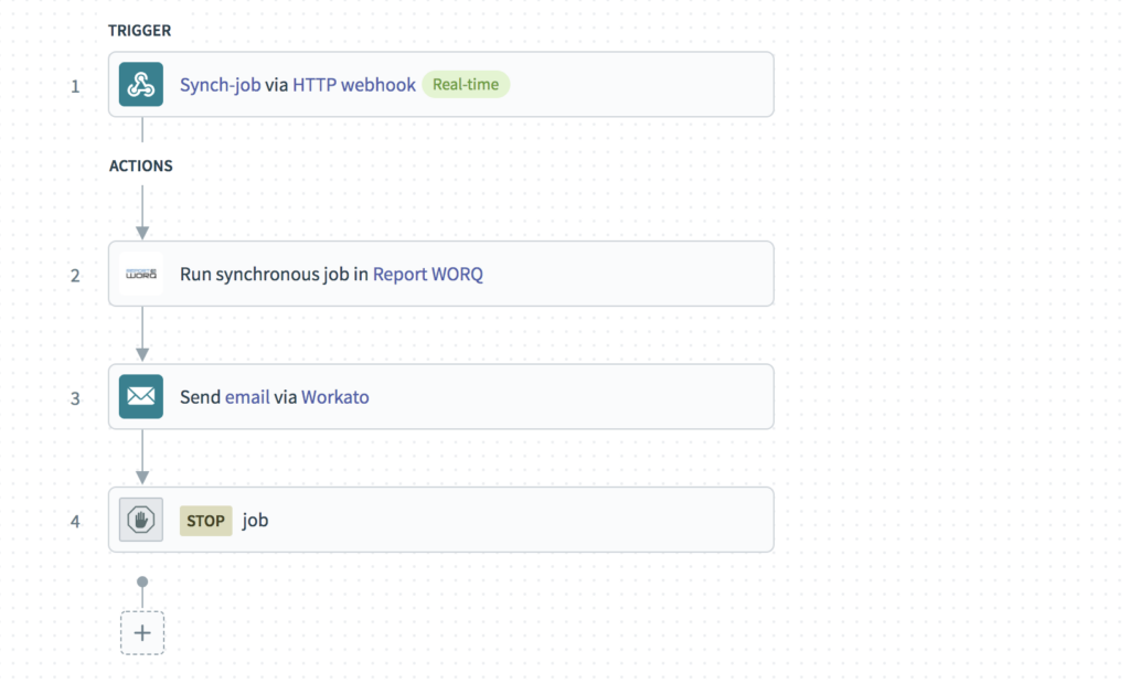 In this example we will create a recipe that runs a synchronous job in ReportWORQ and sends a status email: