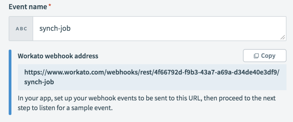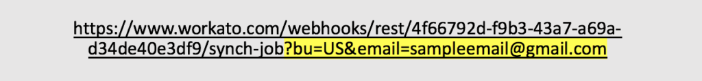 A Webhook is a link – when it is accessed it will trigger a recipe to begin the following actions. The Webhook link can also take in additional parameters that can be used within the recipe. After configuring the Webhook you will be provided with a Workato-generated link: