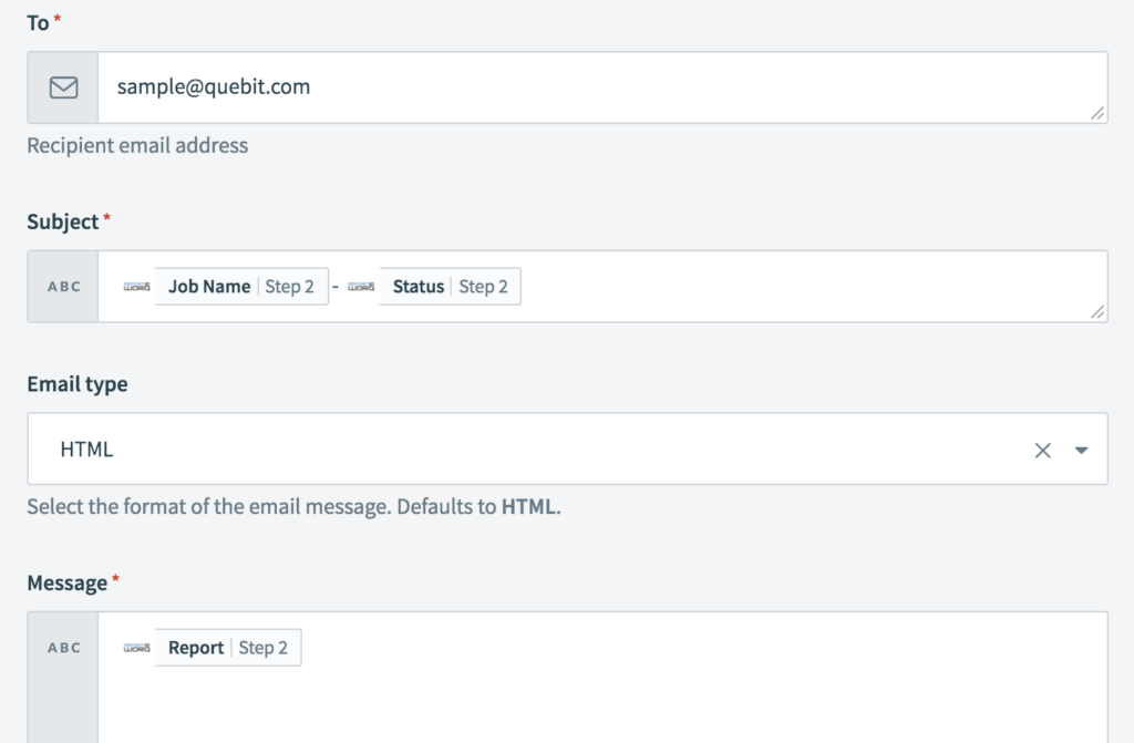 The last step of the recipe is to send an email when the action has been completed. This email will not contain the report created by running the job, but it will contain the job status at the end of the run action. Within the email we will use Workato “datapills” (outputs from previous actions in the recipe) to create a message that updates a user on the status of the job: