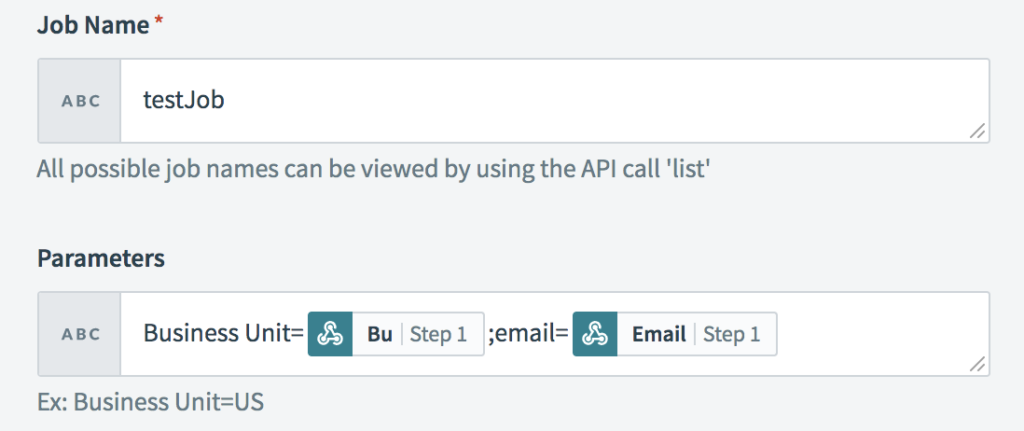 - Parameters: a semicolon-delimited list of additional inputs (Ex: Business Unit=Canada; channel=Slack channel)