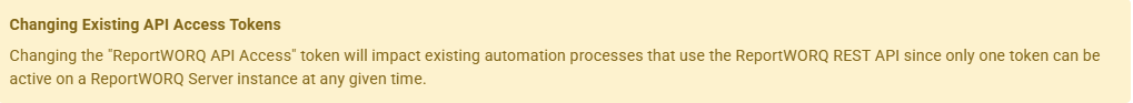 Changing the “ReportWORQ Cloud API Access” token will impact existing automation processes that use the ReportWORQ REST API via the Cloud Connector, since only one token can be active at a time, per ReportWORQ Server instance.