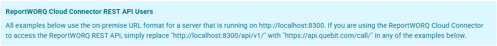 Authorization is performed by providing the ReportWORQ Cloud Connector Token in the header of the request or the request query string. Making ReportWORQ REST API calls via the ReportWORQ Cloud Connector is identical to making those same calls from the local network, except that the URL endpoint used is different. These differences are documented in more detail, along with all REST API commands, in the ReportWORQ API topic.