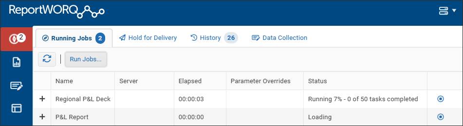 The Running Jobs tab displays a list of ReportWORQ Jobs that are currently executing, regardless of how the Job was triggered.