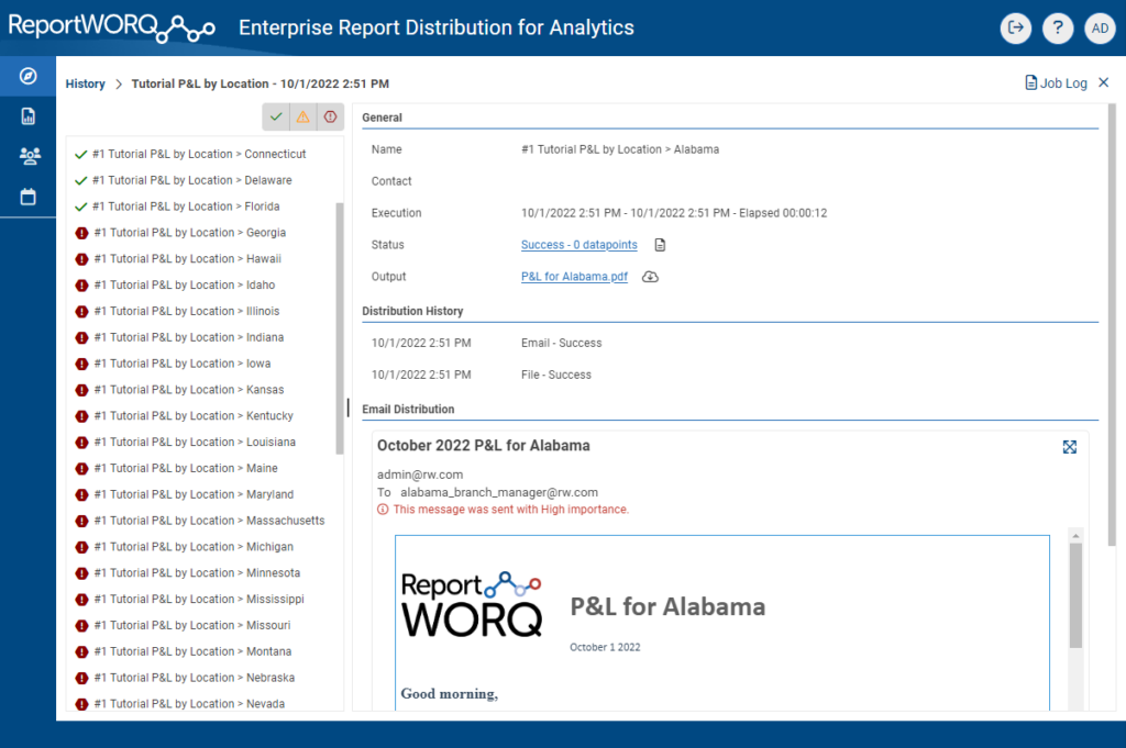 ReportWORQ retains history information for each executed job. This allows the ReportWORQ user to monitor progress, access history, and diagnose issues. Elapsed time and status information about the overall job execution is readily available on the history screen. The user can drill into the details of a job execution by selecting the hyperlink in the Name column or by choosing the information icon in the actions column. In the Job History details screen (shown below) the user can review each report that was generated and distributed by ReportWORQ. Status information will indicate which reports were successful, had calculation warnings, or failed to generate. The right-hand pane will provide a status log file that may contain calculation warnings or errors for diagnosis. If an output file was generated it can be downloaded and reviewed from this screen directly. If the report was distributed then the Distribution History section will indicate the distribution method, date and time, status, or error message. The bottom section of this pane will display specific distribution details for each distribution method along with an option to resend the reports if needed. If any errors were encountered in the overall job execution process then they may appear in the Job Log which can be accessed by selecting the Job Log button in the top right corner of this page. To return to the history list either choose the X in the top-right corner of the History breadcrumb in the top-left corner of this screen.
